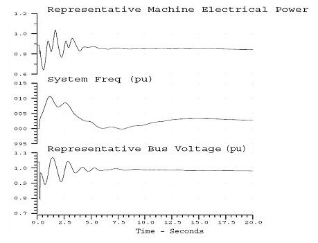 暫態(tài)分析看出:事故后20s內(nèi),頻率和電壓經(jīng)過搖擺后穩(wěn)定;電壓有所下降。系統(tǒng)顯現(xiàn)了比較樂觀的響應(yīng)。