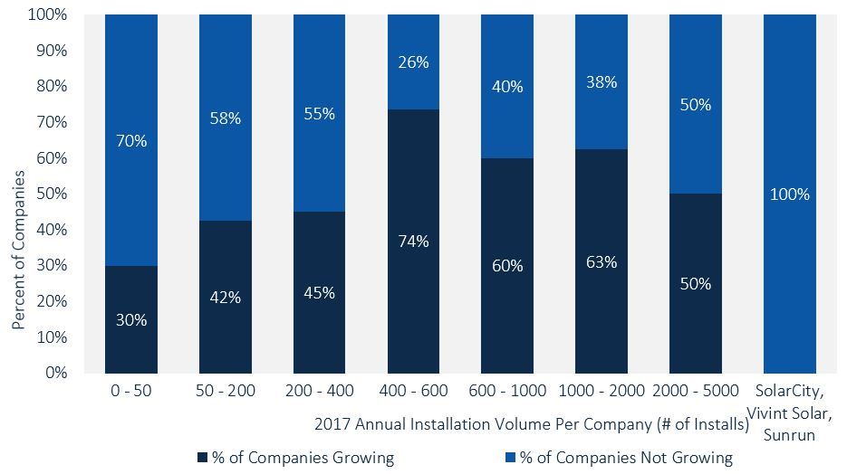 積極的一面是,在2016年和2017年,超過(guò)一半的太陽(yáng)能安裝人員每年進(jìn)行200多次安裝。如果我們深入挖掘,加利福尼亞州市場(chǎng)公司安裝增長(zhǎng)的最佳位置是每年安裝400至600個(gè)(相當(dāng)于每年安裝約3至4兆瓦的安裝容量)。對(duì)于比這更大的公司,如上所示,增長(zhǎng)前景逐漸減弱。