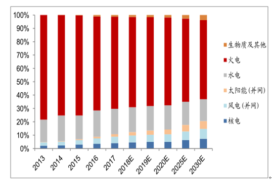 近年來(lái),非化石能源發(fā)電裝機(jī)有望在國(guó)內(nèi)電源裝機(jī)結(jié)構(gòu)中持續(xù)提升??紤]我國(guó)資源稟賦情況及長(zhǎng)期能源安全,非化石能源利用將是國(guó)內(nèi)能源結(jié)構(gòu)轉(zhuǎn)型的的必由之路,而非化石能源的有效利用將更多依賴(lài)向電能的轉(zhuǎn)化,因此國(guó)內(nèi)非化石能源在發(fā)電裝機(jī)占比和發(fā)電量占比方面,將在“十三五”期間持續(xù)提升。結(jié)合非化石能源利用方式來(lái)看,清潔能源發(fā)電裝機(jī)持續(xù)增長(zhǎng)預(yù)期,最值得關(guān)注。展望2030年,預(yù)計(jì)我國(guó)發(fā)電總裝機(jī)將超過(guò)2,800GW,火電的占比將自 2017年的62%降至 50%,非水清潔能源(風(fēng)、光、核)的合計(jì)占比將自2017年的18.6%升至34.4%;屆時(shí)全國(guó)年用電總量將達(dá)到9.3萬(wàn)億度,核電、風(fēng)電、太陽(yáng)能發(fā)電的占比將分別達(dá)到 7.35%、7.37%、5.81%。