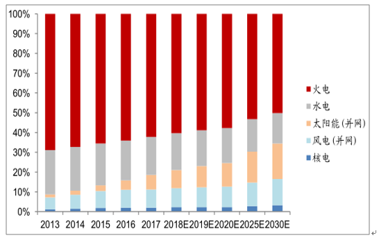 2013-2030年我國(guó)主要類(lèi)型電源裝機(jī)占比統(tǒng)計(jì)與預(yù)測(cè)