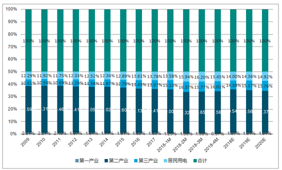2009-2018 全國分產(chǎn)業(yè)用電占占比(億千瓦時)