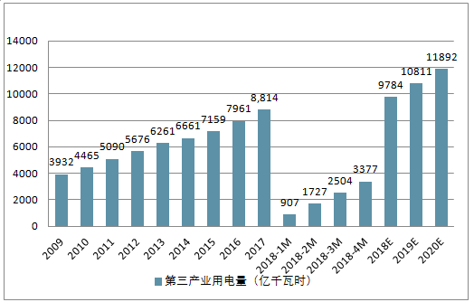 2009-2018 全國第三產(chǎn)業(yè)用電數(shù)據(jù)及預(yù)測(億千瓦時)