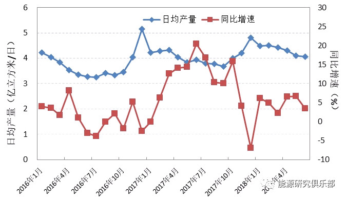 今年上半年,我國天然氣產(chǎn)量775億立方米,同比增長4.6%。逐月來看,采暖季過后,國內(nèi)產(chǎn)量隨需求逐漸下降,日均產(chǎn)量由1月的4.5億立方米/日下降至6月的4.1億立方米/日。