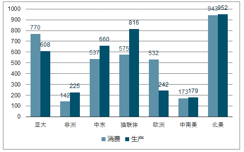 2017 年全球分地區(qū)天然氣消費量與生產(chǎn)量