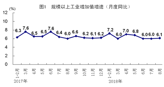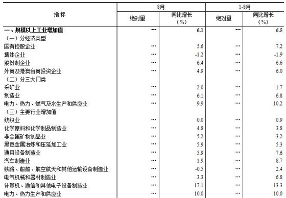 8月份,全國規(guī)模以上工業(yè)增加值同比實(shí)際增長6.1%,增速比上月加快0.1個(gè)百分點(diǎn);1-8月份,全國規(guī)模以上工業(yè)增加值同比增長6.5%,增速比1-7月份回落0.1個(gè)百分點(diǎn)。分經(jīng)濟(jì)類型看,8月份,國有控股企業(yè)增加值同比增長5.6%,集體企業(yè)下降1.2%,股份制企業(yè)增長6.4%,外商及港澳臺商投資企業(yè)增長4.9%。分三大門類看,8月份,采礦業(yè)增加值同比增長2.0%,制造業(yè)增長6.1%,電力、熱力、燃?xì)饧八a(chǎn)和供應(yīng)業(yè)增長9.9%。工業(yè)發(fā)展繼續(xù)邁向中高端。1-8月份,高技術(shù)制造業(yè)、裝備制造業(yè)和戰(zhàn)略性新興產(chǎn)業(yè)同比分別增長11.9%、8.8%和8.8%,分別快于規(guī)模以上工業(yè)5.4、2.3和2.3個(gè)百分點(diǎn)。工業(yè)新產(chǎn)品快速成長。1-8月份,新能源汽車、工業(yè)機(jī)器人、集成電路產(chǎn)量同比分別增長56.0%、19.4%和13.4%。企業(yè)利潤較快增長。1-7月份,全國規(guī)模以上工業(yè)企業(yè)實(shí)現(xiàn)利潤總額39038億元,同比增長17.1%;主營業(yè)務(wù)收入利潤率為6.46%,比上年同期提高0.4個(gè)百分點(diǎn)。