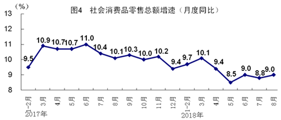 8月份,社會(huì)消費(fèi)品零售總額31542億元,同比增長9.0%,增速比上月加快0.2個(gè)百分點(diǎn);1-8月份,社會(huì)消費(fèi)品零售總額同比增長9.3%,增速與1-7月份持平。按經(jīng)營單位所在地分,8月份,城鎮(zhèn)消費(fèi)品零售額27169億元,同比增長8.8%;鄉(xiāng)村消費(fèi)品零售額4373億元,增長10.2%。按消費(fèi)類型分,8月份,餐飲收入3516億元,增長9.7%;商品零售28026億元,增長8.9%。升級類商品銷售增長較快。1-8月份,限額以上單位商品零售額中,化妝品類、家具類商品零售額同比分別增長12.6%和10.2%,增速分別比社會(huì)消費(fèi)品零售總額快3.3和0.9個(gè)百分點(diǎn)。新消費(fèi)發(fā)展較快。1-8月份,全國網(wǎng)上零售額55195億元,同比增長28.2%。其中,實(shí)物商品網(wǎng)上零售額41993億元,增長28.6%,占社會(huì)消費(fèi)品零售總額的比重為17.3%,比上年同期提高3.5個(gè)百分點(diǎn);非實(shí)物商品網(wǎng)上零售額13202億元,增長27.2%。