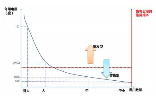 紅色的縱坐標(biāo)代表每一家售電公司新增加一個售電客戶所需要投入的成本。從廣東的售電市場情況看,對于大多數(shù)售電公司來講,不管用戶體量的大小,每跑一個客戶投入的時間精力都是差不多的,這是由這根紅色的虛線所確定的。這對于大的售電公司來講,用戶數(shù)量到一定程度之后,再去跑中小型的客戶成本就很難承受。所以由于邊際成本的固定,使得未來售電公司會有一個很明確的選擇,是著重拓展大用戶,以體量取得交易的優(yōu)勢還是在邊際成本線以下,依靠屬地化的優(yōu)勢,降低邊際成本,以客戶數(shù)量取勝?這個選擇就會帶來售電公司的分化,即批發(fā)型售電公司和零售型售電公司的分化。