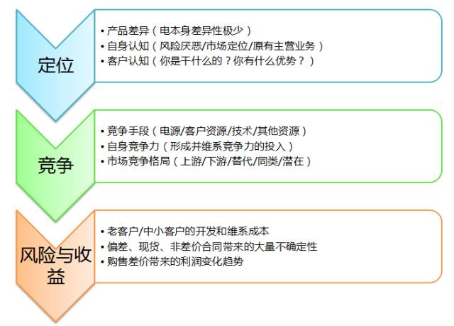 售電公司的分化可以從三個維度來分析:一是定位,不同的售電公司有自己的定位,例如是偏向于客戶服務(wù)還是客戶交易。二是競爭,不同的售電公司因?yàn)楦偁幍氖侄魏唾Y源不一樣,會有相應(yīng)的分化,例如有電源和沒有電源的售電公司就完全不一樣。三是風(fēng)險(xiǎn)和收益。售電公司對風(fēng)險(xiǎn)的忍耐程度是不一樣的,例如有的售電公司會認(rèn)為沒有必要承擔(dān)偏差帶來的不確定性。