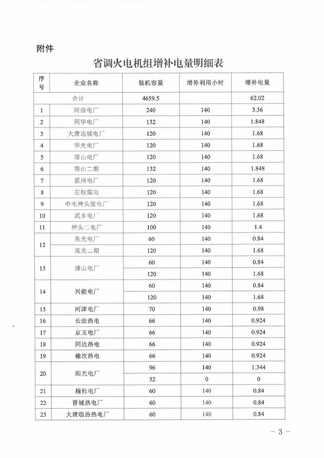 12月4日,山西經(jīng)信委下發(fā)了一份增補省調(diào)火電機組基礎(chǔ)利用小時數(shù)的文件,由于部分自備發(fā)電企業(yè)檢修不能完成年度發(fā)電量計劃,決定對現(xiàn)役火電機組增補基礎(chǔ)利用小時數(shù)140小時,增補電量合計62 02億千瓦時,這本來是一
