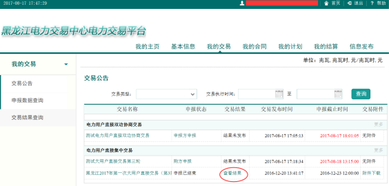 交易結(jié)果發(fā)布后,在首頁“待辦消息”或“我的交易”中查詢交易結(jié)果:
