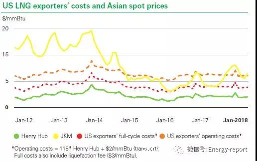 用日韓指標(biāo)代表亞洲LNG現(xiàn)貨價(jià)格,該指標(biāo)在過去的幾年中在美國出口全周期成本和它們的短期運(yùn)營成本之間震蕩。美國LNG的出口商更愿意按照能覆蓋其運(yùn)營成本的時(shí)間供應(yīng)LNG,即使短期運(yùn)營成本低于他們的全周期成本。