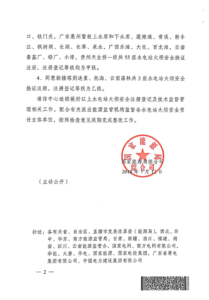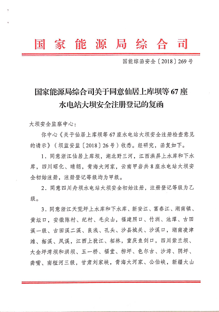 能源局:關(guān)于同意仙居上庫壩等67座水電站大壩安全注冊登記的復(fù)函