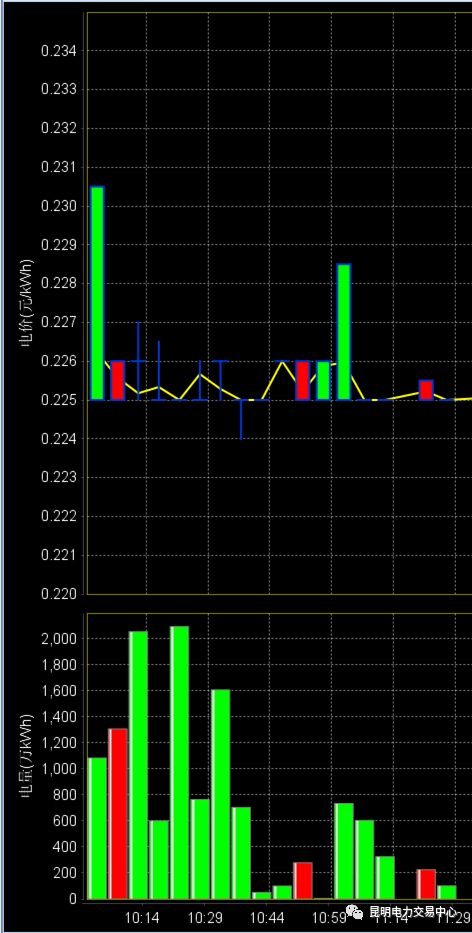 10:00:25 首單成交,成交電量21萬千瓦時,成交價0.2305元/千瓦時,高出集合競價的平均成交價6.34厘/千瓦時。