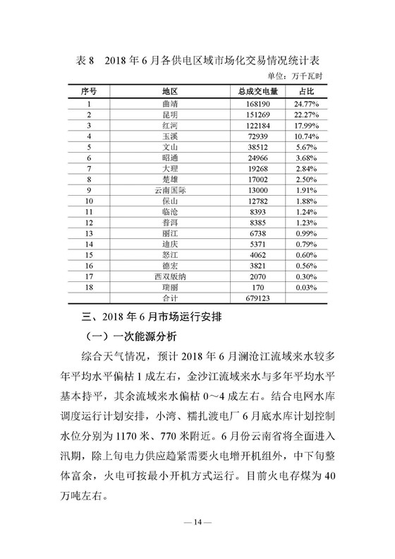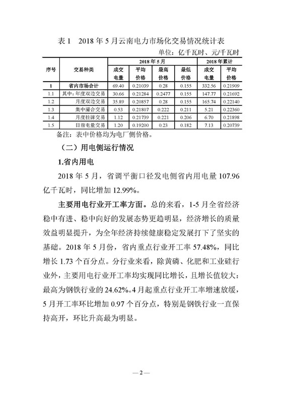 昆明電力交易中心日前發(fā)布了《云南電力交易月報(2018年6月)》,2018年5月,日前電量市場累計(jì)成交電量1 2億千瓦時,占當(dāng)月總交易電量的1 72%