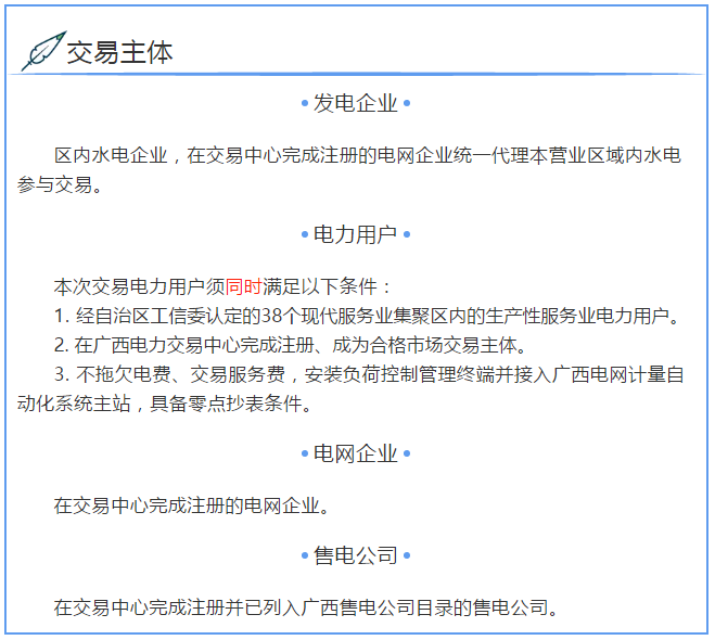 廣西電力交易中心發(fā)布的《關(guān)于開展2018年8月現(xiàn)代服務(wù)業(yè)集聚區(qū)用電市場化交易的通知》文件,發(fā)電企業(yè):區(qū)內(nèi)水電企業(yè),在交易中心完成注冊的電網(wǎng)企業(yè)統(tǒng)一代理本營業(yè)區(qū)域內(nèi)水電參與交易。