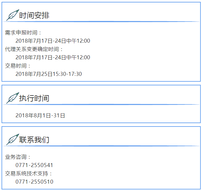 售電公司:在交易中心完成注冊,列入廣西售電公司目錄的售電公司。需求申報時間:2018年7月17日-24日中午12:00;代理關(guān)系變更確定時間:2018年7月17日-24日中午12:00;交易時間:2018年7月25日15:30-17:30