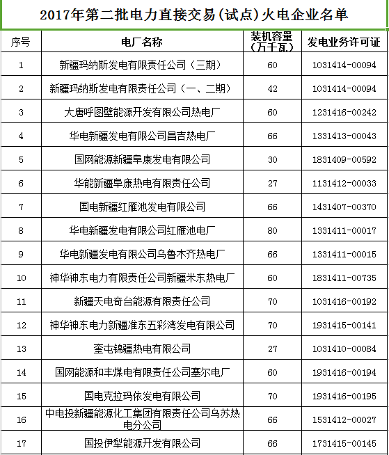附件:1. 2017年第二批電力直接交易(試點(diǎn))火電企業(yè)公示名單