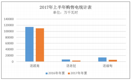 2017 年上半年,云南電網(wǎng)累計(jì)送境外電量 11.90 億千瓦時(shí),同比減少 12.01%。其中,送越南 10.98 億千瓦時(shí),同比減少 4.19%;送老撾 0.33 億千瓦時(shí),同比減少 50.61%;送緬甸 0.58 億千瓦時(shí),同比減少 58.08%。
