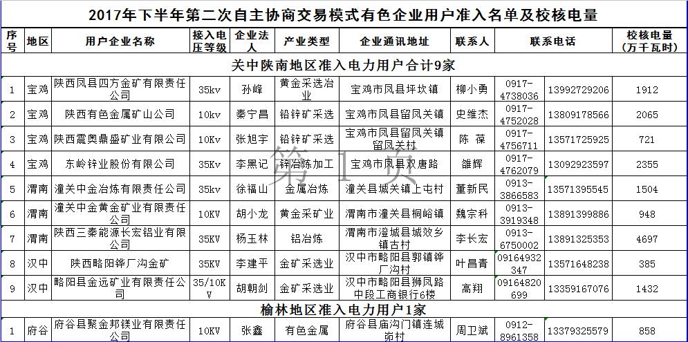 2017年9月21日陜西省發(fā)改委發(fā)布《陜西省2017年下半年第二次自主協(xié)商模式電力直接交易有關(guān)事項公告》,決定組織開展下半年第二次電力直接交易,53家用戶合計電量16 76億千瓦時。本次10家有色行業(yè)企業(yè)不受電壓等級