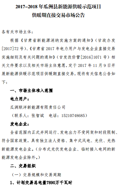 近日,發(fā)布了《2017-2018年通渭縣新能源供暖示范項目供暖期直接交易市場公告》《2017-2018年瓜洲縣新能源供暖示范項目供暖期直接交易市場公告》計劃交易總電量分別為1300萬千瓦時、7890萬千瓦時交易周期對應供暖