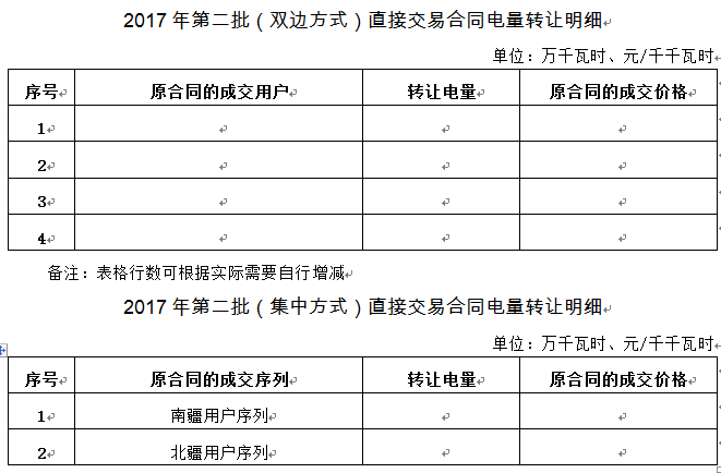 (3)針對(duì)2017年上半年新增電量雙邊交易合同電量轉(zhuǎn)讓明細(xì),若存在同一發(fā)電企業(yè)與同一用戶以不同電價(jià)成交,需分別填寫(xiě)原合同中每個(gè)成交價(jià)格對(duì)應(yīng)的電量,否則交易申報(bào)數(shù)據(jù)作廢。