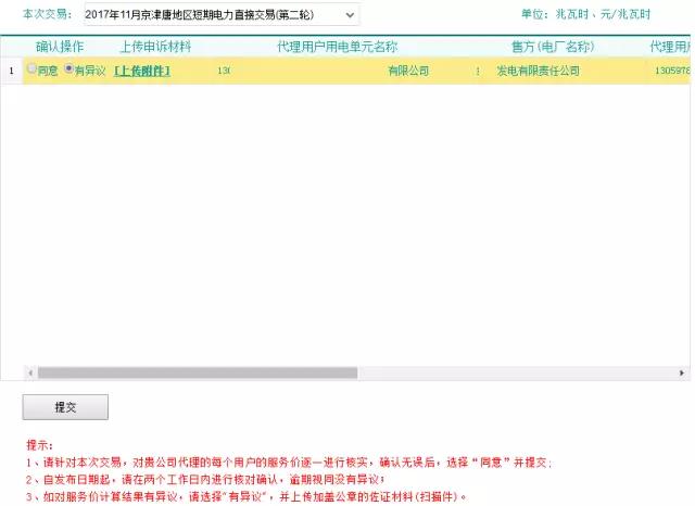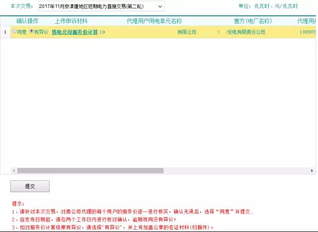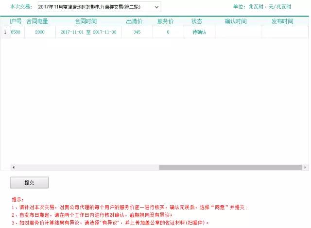 5.請(qǐng)逐條核對(duì)所代理用戶的購(gòu)售電服務(wù)價(jià)格。若服務(wù)價(jià)格核對(duì)無(wú)誤,請(qǐng)選擇“同意”,并點(diǎn)擊【提交】。