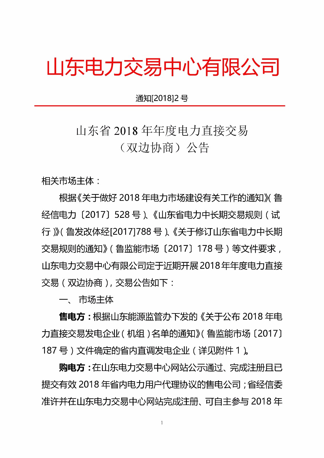 山東省2018年年度電力直接交易(雙邊協(xié)商)公告