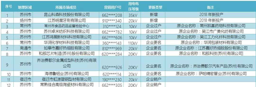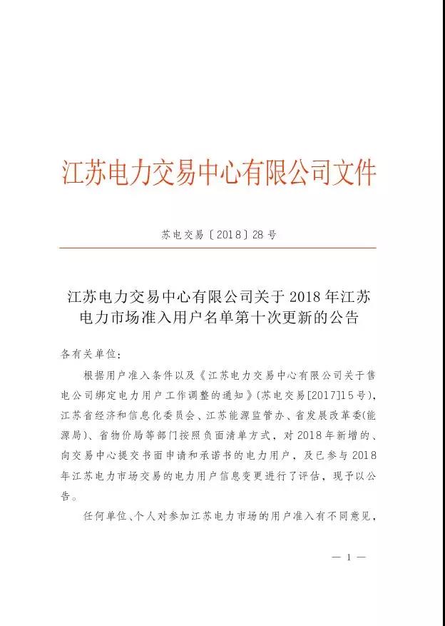 2018年10月19日,江蘇電力交易中心發(fā)布關于2018年江蘇電力市場準入用戶名單第十次更新的公告。根據(jù)用戶準入條件以及《江蘇電力交易中心有限
