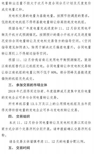 江蘇2018年11-12月發(fā)電企業(yè)合同電量轉(zhuǎn)讓及發(fā)電權(quán)交易:售方獲得的40%基數(shù)獎勵電量不隨交易轉(zhuǎn)讓