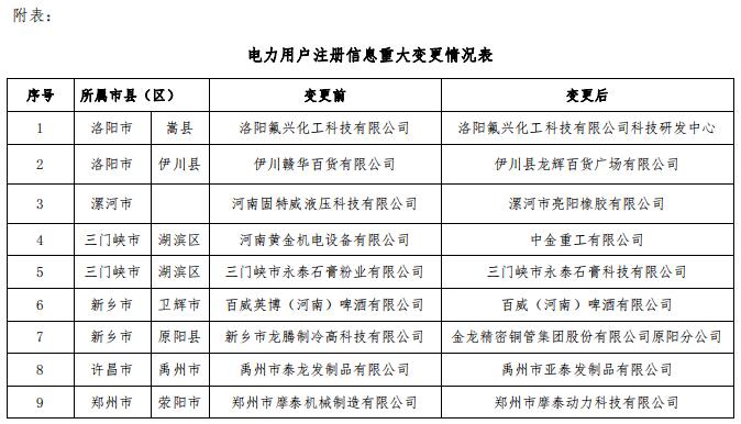 河南公示申請注冊信息重大變更的16家電力用戶(第九批)