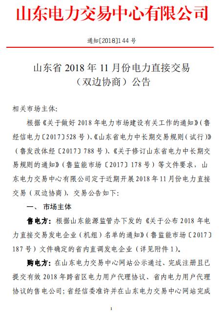 山東2018年11月電力直接交易(雙邊協(xié)商):協(xié)商的直接交易電量為購電方用電量