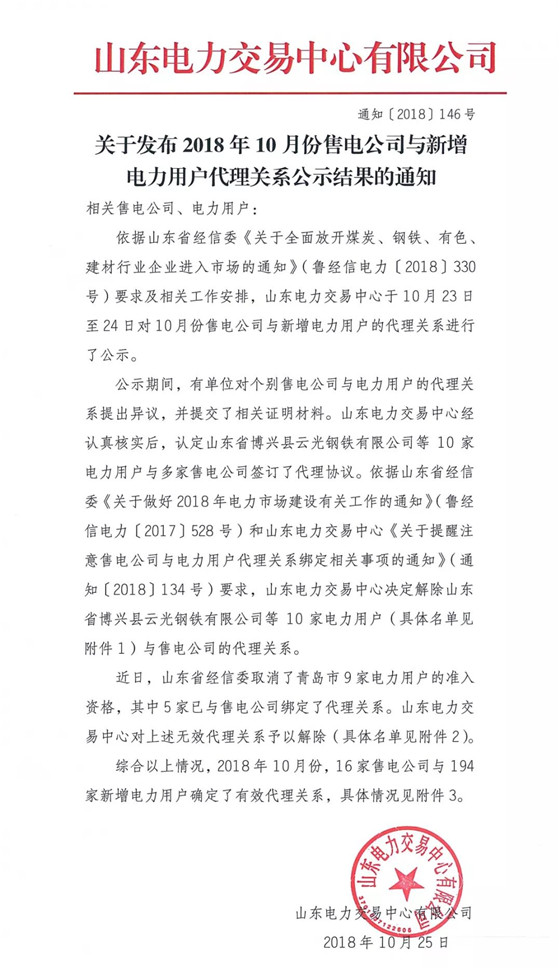 山東電力交易中心日前發(fā)布了《關于發(fā)布2018年10月份售電公司與新增電力用戶代理關系公示結果的通知》,山東電力交易中心于10月23日至24日對10月份售電公司與新增電力用戶的代理關系進行了公示。公示期間,有單位對個別售電公司與電力用戶的代理關系提出異議,并提交了相關證明材料。山東電力交易中心經(jīng)認真核實后,認定山東省博興縣云光鋼鐵有限公司等10家電力用戶與多家售電公司簽訂了代理協(xié)議,決定解除山東省博興縣云光鋼鐵有限公司等10家電力用戶與售電公司的代理關系。