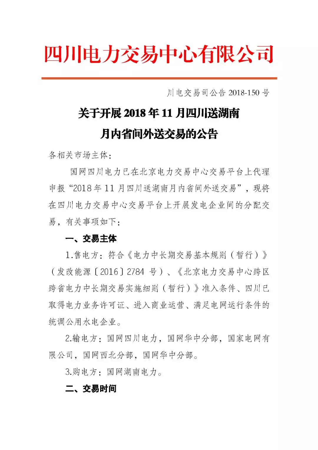 公告 | 關(guān)于開展2018年11月四川送湖南月內(nèi)省間外送交易的公告