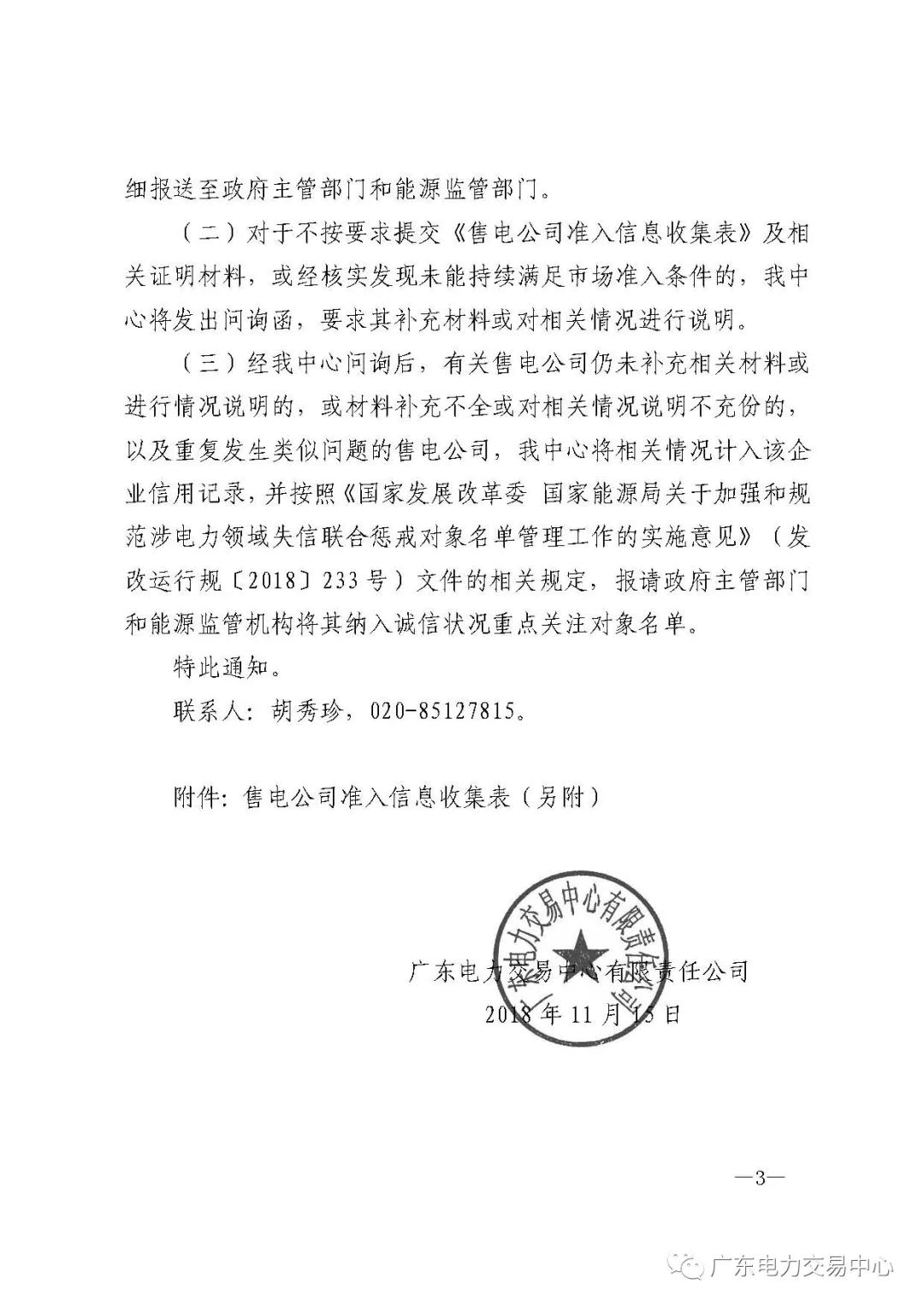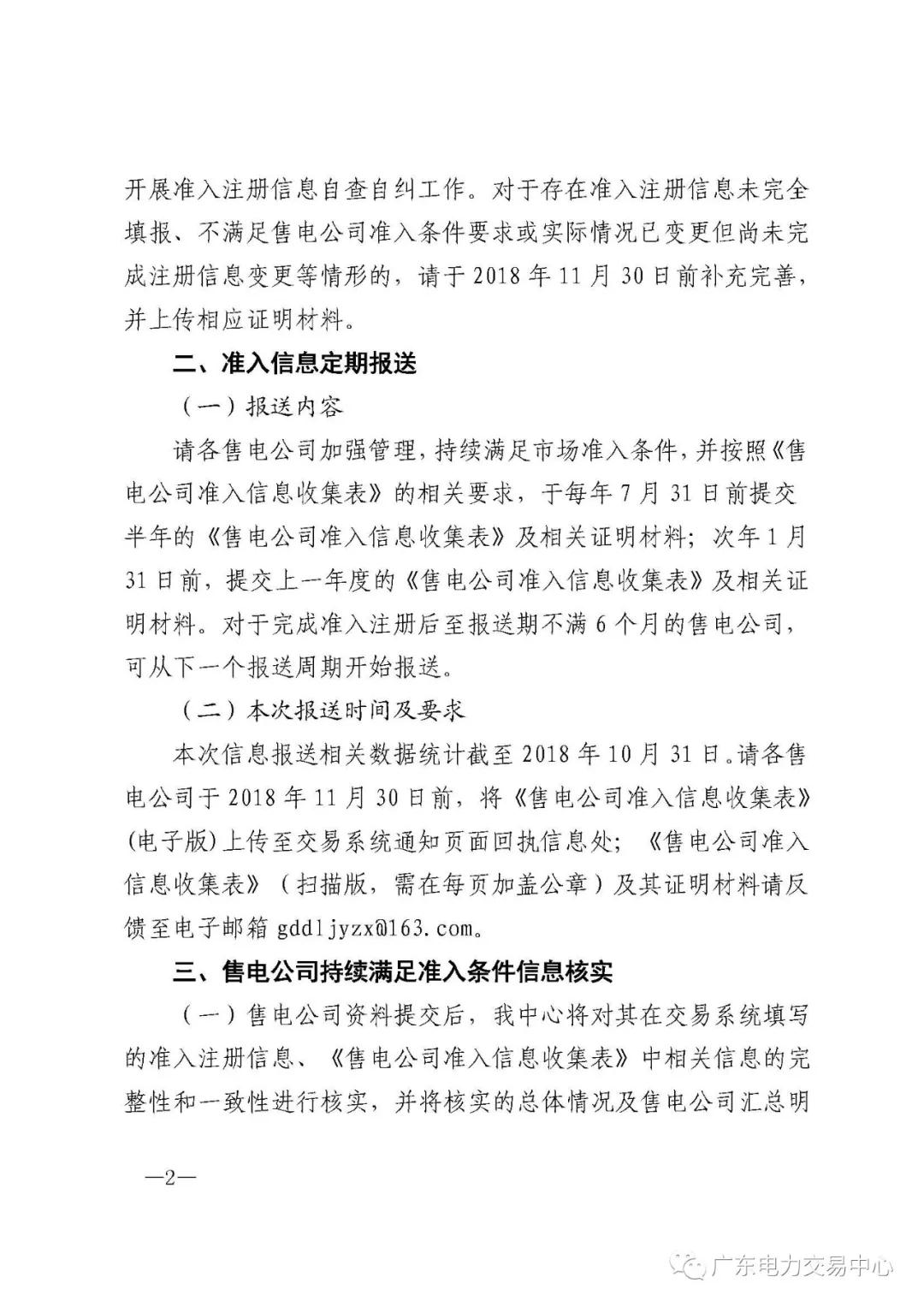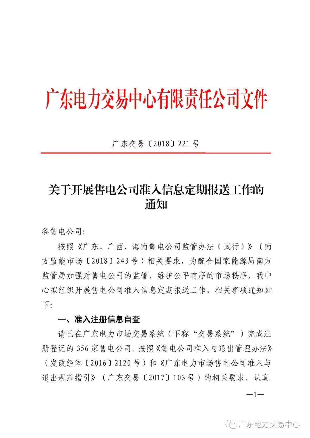 廣東電力交易中心日前發(fā)布了《關(guān)于開展售電公司準(zhǔn)入信息定期報(bào)送工作的通知》,廣東擬組織開展售電公司準(zhǔn)入信息定期報(bào)送工作,已完成注冊(cè)等級(jí)的356家售電公司需認(rèn)真開展準(zhǔn)入信息自糾自查工作。對(duì)于存在準(zhǔn)入注冊(cè)信息未完全填報(bào)、不滿足售電公司準(zhǔn)入條件要求或?qū)嶋H情況已變更但尚未完成注冊(cè)信息變更等情形的, 請(qǐng)于2018年11月30日前補(bǔ)充完善,并上傳相應(yīng)證明材料。