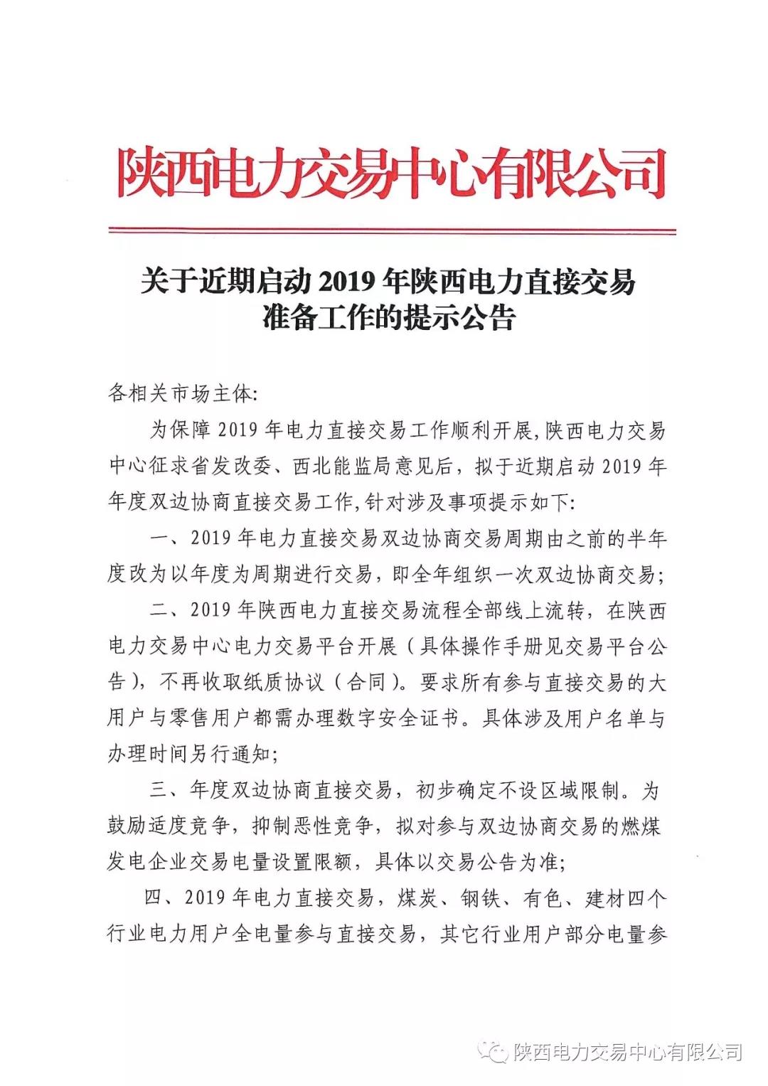 關(guān)于近期啟動(dòng)2019年陜西電力直接交易準(zhǔn)備工作的提示公告