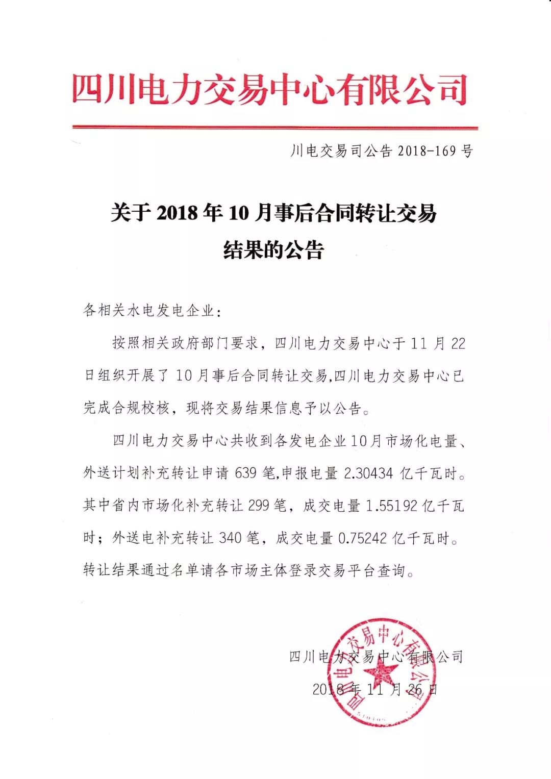 公告 | 四川電力交易中心關(guān)于2018年10月事后合同轉(zhuǎn)讓交易結(jié)果的公告