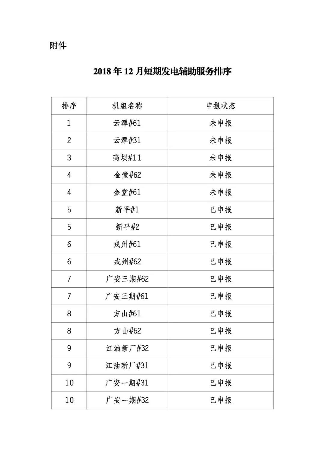 按《2018年四川電力交易指導(dǎo)意見》(川能監(jiān)市場〔2018〕40號)的要求,四川電力交易中心于11月23日開展了2018年12月短期發(fā)電輔助服務(wù)交易,共20家發(fā)電廠(調(diào)度單元)進(jìn)行了申報,5家未申報。根據(jù)各燃煤火電機組的申報價格,形成12月短期發(fā)電輔助服務(wù)交易排序,現(xiàn)予以公告。