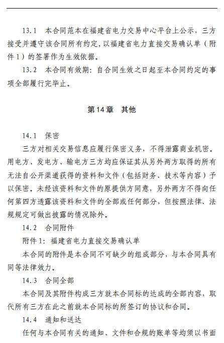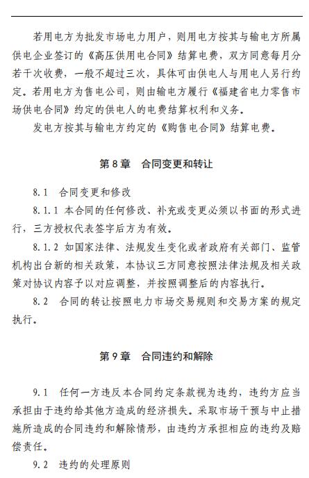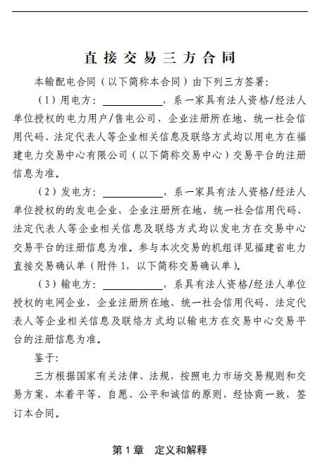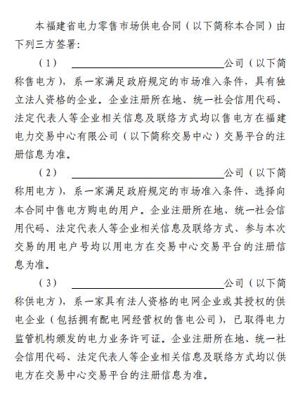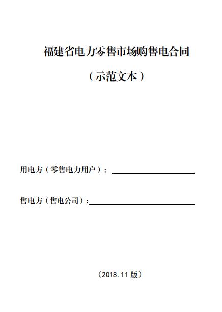 其中公布了福建省電力直接交易三方合同(示范文本)、福建省電力零售市場供電合同(示范文本)、福建省電力零售市場購售電合同(示范文本)、福建省電力市場化交易授權(quán)協(xié)議(示范文本)