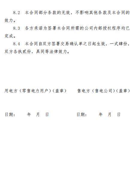 本合同范本在福建省電力交易中心平臺上公示,雙方接受并遵守該合同所有約定,以交易確認(rèn)單的簽署作為生效依據(jù),合同有效期以交易確認(rèn)單(附件 1)為準(zhǔn)。