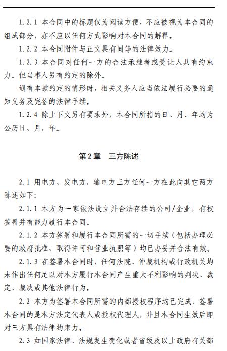 1.2 根據(jù)相關(guān)法律法規(guī)和政策規(guī)定,本合同三方主體按照自愿原則簽訂,并依據(jù)本合同約定進行電力市場化交易業(yè)務(wù)結(jié)算。