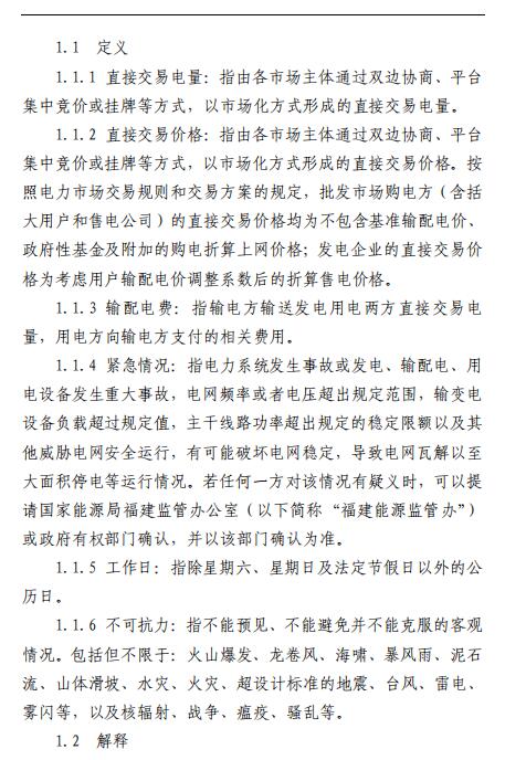 1.3 本合同中提到的電力市場化交易業(yè)務(wù)結(jié)算僅適用于現(xiàn)階段福建省市場化交易結(jié)算模式。如國家法律、法規(guī)發(fā)生變化或者政府有關(guān)部門、監(jiān)管機構(gòu)出臺新的相關(guān)政策,本合同三方同意按照法律法規(guī)及相關(guān)政策對合同內(nèi)容予以對應(yīng)調(diào)整,并按照調(diào)整后的內(nèi)容執(zhí)行。