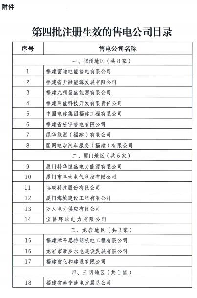 據(jù)悉,福建電力交易中心日前發(fā)布了《關于福建省第四批售電公司注冊生效的通知》,第四批18家售電公司注冊手續(xù)自動生效。