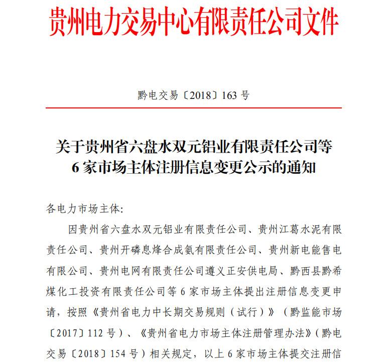 關(guān)于貴州省六盤(pán)水雙元鋁業(yè)有限責(zé)任公司等6家市場(chǎng)主體注冊(cè)信息變更公示的通知