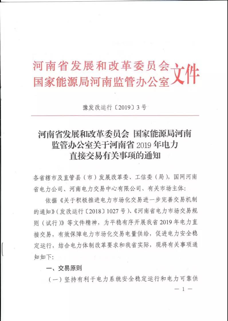 河南省發(fā)布《關(guān)于河南省2019年電力直接交易有關(guān)事項(xiàng)通知》