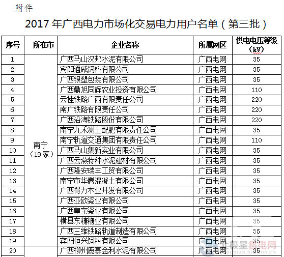 廣西:關(guān)于擬列入2017年電力市場(chǎng)化交易電力用戶(hù)準(zhǔn)入名單(第三批)的公示