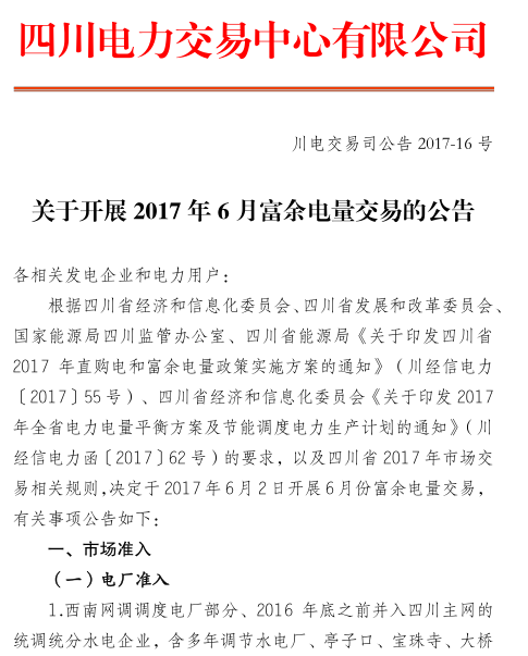 近日,四川電力交易中心發(fā)布了《關于開展2017年6月富余電量交易的公告》,將于今日(6月2日)開展6月份富余電量交易。