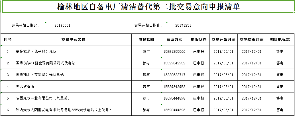 陜西榆林地區(qū)自備電廠清潔替代交易第二批新能源企業(yè)公示名單