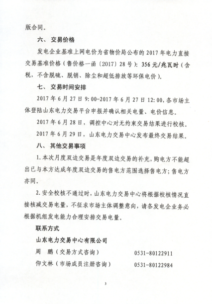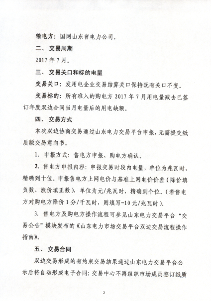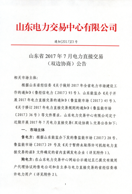 山東電力交易中心6月26日發(fā)布了山東省2017年7月電力直接交易(雙邊協(xié)商)公告,公告中稱,將于6月27日9:00-12:00開展山東省2017年7月電力直接交易(雙邊協(xié)商),交易價格為發(fā)電企業(yè)基準上網(wǎng)電價為省物價局公布的2017年電力直接交易基準價格(魯價格一函[2017]28號):356元/兆瓦時(含稅,不含脫硫、脫硝、除塵和超低排放等環(huán)保電價)。交易標的為所有準入的購電方2017年7月用電量減去已簽訂年度雙邊合同電量后的用電缺額。