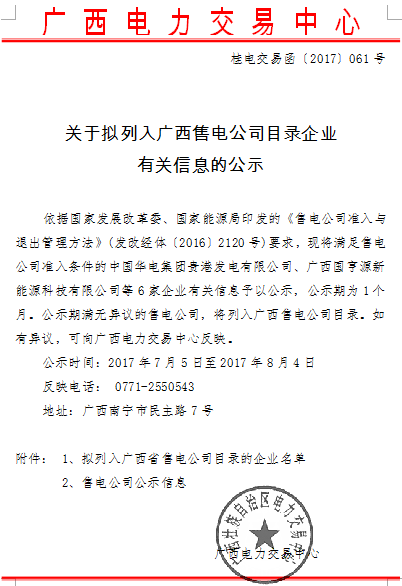 依據(jù)國家發(fā)展改革委、國家能源局印發(fā)的《售電公司準(zhǔn)入與退出管理方法》(發(fā)改經(jīng)體〔2016〕2120號)要求,現(xiàn)將滿足售電公司準(zhǔn)入條件的中國華電集團貴港發(fā)電有限公司、廣西國亨源新能源科技有限公司等6家企業(yè)有關(guān)信息予以公示,公示期為1個月。公示期滿無異議的售電公司,將列入廣西售電公司目錄。如有異議,可向廣西電力交易中心反映。 公示時間:2017年7月5日至2017年8月4日 反映電話: 0771-2550543 地址:廣西南寧市民主路7號