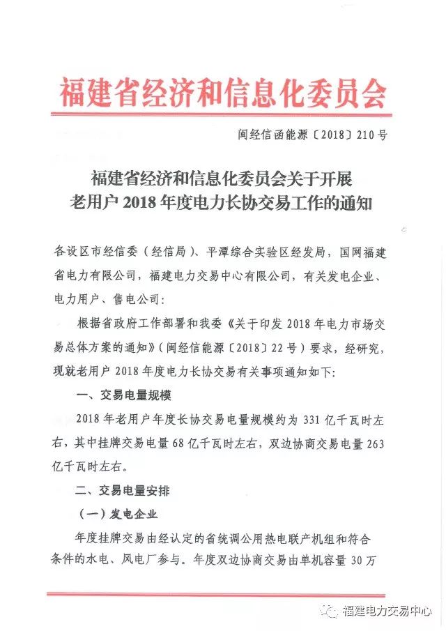 福建省經(jīng)信委日前發(fā)布了《關(guān)于開展老用戶2018年度電力長(zhǎng)協(xié)交易工作的通知》,通知中稱,2018年老用戶年度長(zhǎng)協(xié)交易電量規(guī)模約為331億千瓦時(shí)左右,其中掛牌交易電量68億千瓦時(shí)左右,雙邊協(xié)商交易電量263億千瓦時(shí)左右。